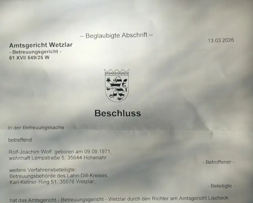 Am 13.3.2026 wird meine Bevormundung durch das Amtsgericht Wetzlar beschlossen.