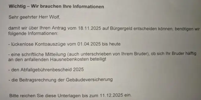 Dienstag 30. Dezember, Tag 2760 als Mordopfer mit Berufsverbot. Immer noch Kalenderwoche 1, der erste Tag war der 29. Dezember. Bis heute ist noch kein Bürgergeld eingetroffen. In Kalenderwoche 46 / 2025 sendete ich das ausgefüllte Formular zur Weiterbewilligung, es lagen keine Änderungen vor.
