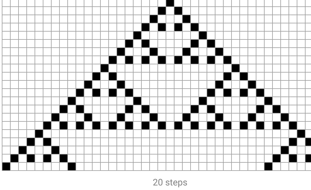 Essen to go. Cell automaton als Arbeitsmittel. Es gibt grafische Tisch Darstellung bei Kassensystemen und Zahlen auf Quittungen, so könnte 99 heissen man solle nichts hinzufügen. Das kann heissen eventuell nicht vor Ort Essen, da "rule 100" nur eine emotionslose Linie sei, oder jemand sammelt für die Zusammenschau und man darf das Essen zwar mitnehmen aber (...).