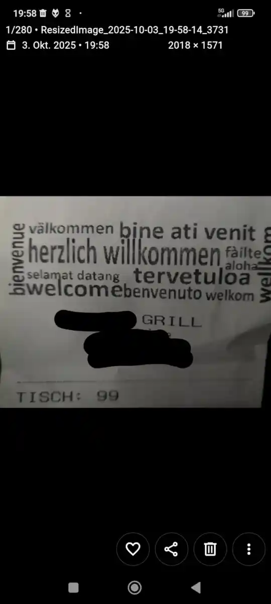 Bild Quittung heutiges, 3.10.2025, Essen "take away" am nahgelegenen Grill, die Leute waren sehr freundlich. Beinahe dasselbe Bild wie das Logo hang in meiner Wohnung bis 2020. Korrektur, ein solches ähnliches Bild Hang an meiner Wohnungstür(?). Könnten denn nicht meine Sozialkontakte unterstützen? Mir fehlt die "Bewegungsart", das ist ja wie Logistik, wenn die IT schläft. Die könnten sonst auch Gabelstapler fahren. Das Klingel-Namensschild von 2012 musste ich entfernen es stand sogar einne zusätzliche Orts-Telefonnummer drauf.